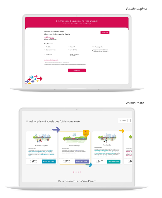 Hipóteses: 1. A visibilidade de mais produtos (5 planos em vez de 2) aumentaria as vendas. 2. Textos explicativos e imagens de apoio facilitariam a identificação do usuário com o plano ideal.