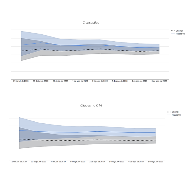 Confrontamos a versão original (2 planos) com a nova versão (5 planos) em um teste com 100% do tráfego (50/50).